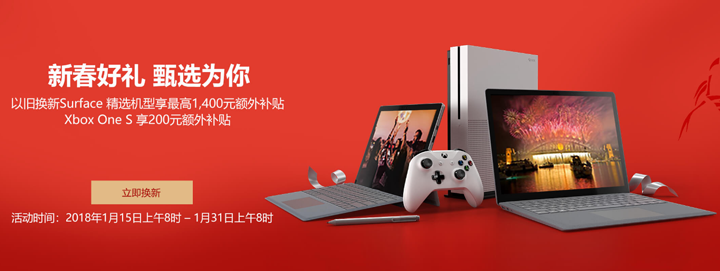 微軟官方商城新春特惠微軟官方商城今日開啟“新春好禮,甄選為你”優(yōu)惠促銷活動,以舊換新Surface精選機(jī)型享最高1400元額外補(bǔ)貼,Xbox One S享200元額外補(bǔ)貼,購機(jī)即可獲贈ALDI優(yōu)惠券,幸運(yùn)用戶更可得ALD
