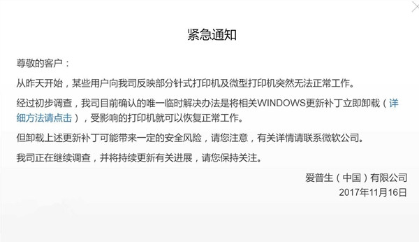 微軟更新補丁導致愛普生打印機無法打印近日,打印機生成廠商在官網(wǎng)發(fā)布了緊急通知:愛普生旗下部分針式打印機與微型打印機突然出現(xiàn)無法正常工作的問題,經(jīng)過排查,這是由于微軟更新補丁所引起的,卸載更新補丁可以臨時救急。那么如何解決呢?下面就讓小編