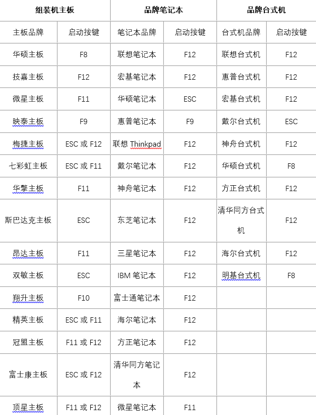 u盤(pán)啟動(dòng)快捷鍵一覽表現(xiàn)在重裝系統(tǒng)已不再是件難事了,一個(gè)普通的u盤(pán)就可以幫你搞定,但是對(duì)于一些小白來(lái)說(shuō)在使用u盤(pán)啟動(dòng)盤(pán)安裝系統(tǒng)是也許會(huì)遇到這樣的小問(wèn)題,面對(duì)一臺(tái)新電腦時(shí)不知道該如何讓電腦優(yōu)先訪問(wèn)u盤(pán)從而進(jìn)入PE系統(tǒng)下進(jìn)行裝機(jī)。今天,韓博士裝機(jī)大師就為大家整理了不同品牌電腦開(kāi)機(jī)啟動(dòng)的快捷熱鍵。