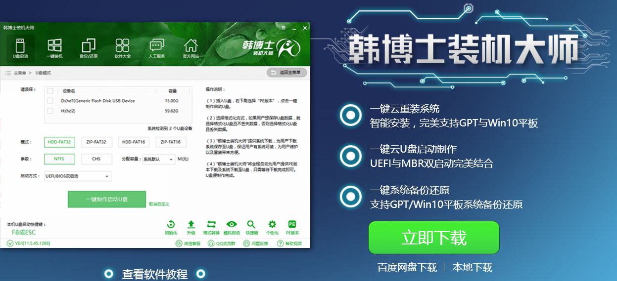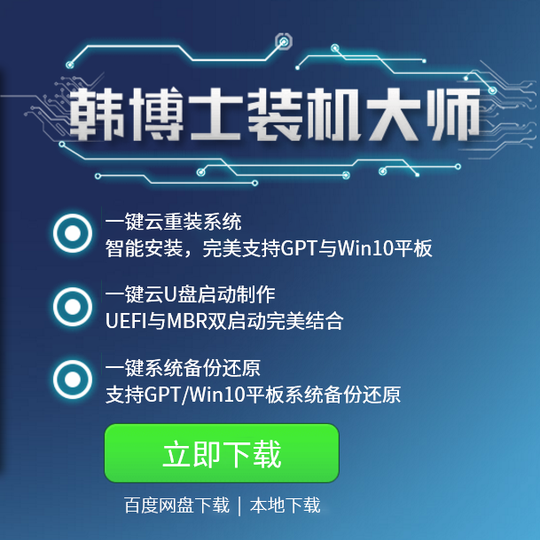 韓博士U盤啟動盤制作|U盤重裝win10系統(tǒng)圖文教程比起傳統(tǒng)的在線一鍵重裝,越來越多的人更加喜歡用U盤重裝系統(tǒng)。要使用U盤重裝系統(tǒng),自然要制作啟動U盤。韓博士裝機大師就有U盤重裝功能。下面就讓小編給大家?guī)眄n博士U盤重裝win10系統(tǒng)圖文教程。