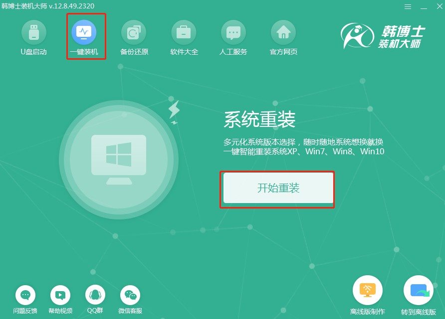 1.把“韓博士裝機(jī)大師”下載到桌面,然后運(yùn)行它。在軟件界面中選擇“一鍵裝機(jī)”,并點(diǎn)擊“開始重裝”按鈕,開始安裝過(guò)程。