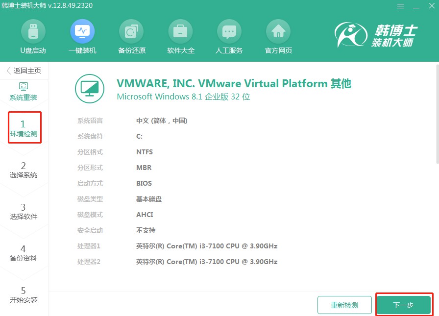 2.目前,系統(tǒng)在進行“環(huán)境監(jiān)測”,需要耐心等待一會兒,等它結(jié)束,點擊“下一步”繼續(xù)操作。