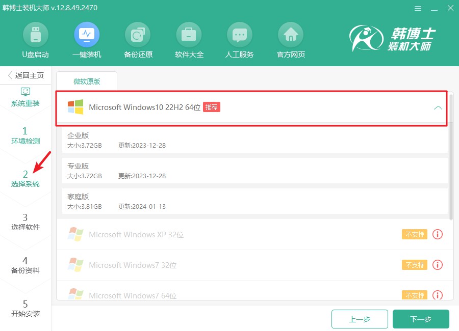 3.進(jìn)入“選擇系統(tǒng)”的步驟后,從列表中挑選出所需的win10系統(tǒng)文件。確保它能與您的設(shè)備完美匹配,然后按“下一步”安裝。