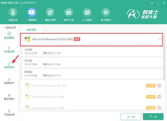 3.進入“選擇系統(tǒng)”界面后,您可以看到不同版本的win10系統(tǒng),選擇最適合您的版本,點擊“下一步”開始安裝。