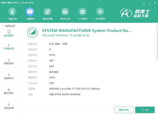 2.韓博士會(huì)先對(duì)您的設(shè)備進(jìn)行環(huán)境檢測(cè),等檢測(cè)結(jié)束后,點(diǎn)擊“下一步”按鈕進(jìn)入下一步操作。