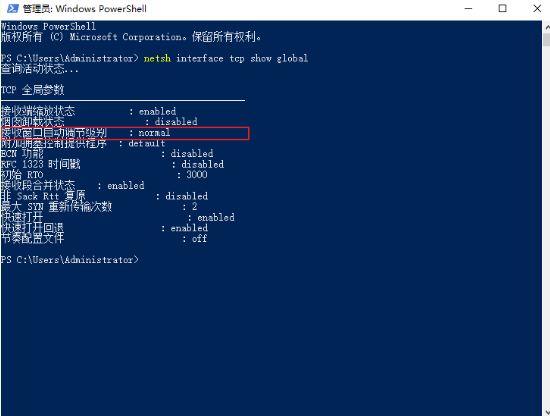 3.電腦開始顯示TCP的全局參數(shù),可以看到接收窗口自動(dòng)調(diào)節(jié)級(jí)別為normal。