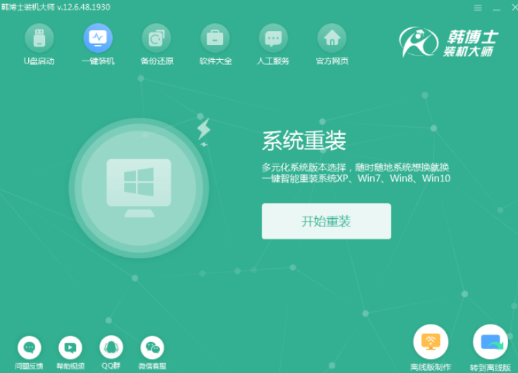 1、打開韓博士裝機(jī)大師,進(jìn)入“一鍵裝機(jī)”選項(xiàng),點(diǎn)擊系統(tǒng)重裝。要注意的是,因?yàn)槭窃诰€重裝系統(tǒng),會(huì)更改到系統(tǒng)文件,所以最好退出殺毒軟件和防火墻,或者在彈窗時(shí)選擇“允許”。