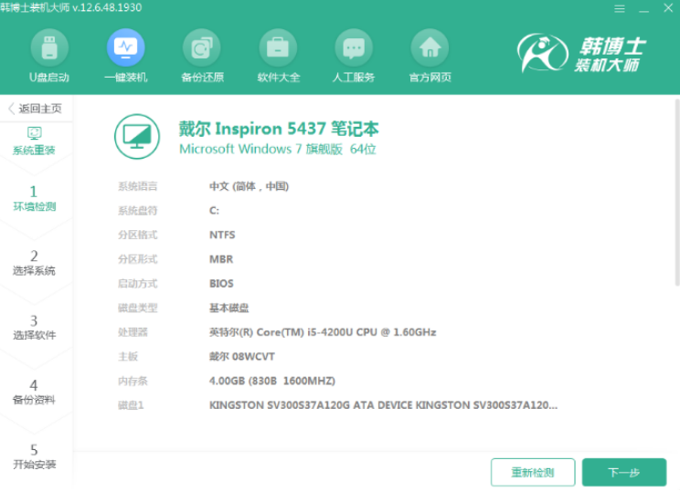 2、點(diǎn)擊系統(tǒng)重裝后,韓博士裝機(jī)大師會(huì)為我們進(jìn)行環(huán)境檢測(cè),顯示電腦配置。韓博士裝機(jī)大師會(huì)給我們推薦安裝的系統(tǒng)。檢測(cè)環(huán)境完成后,點(diǎn)擊“下一步”。
