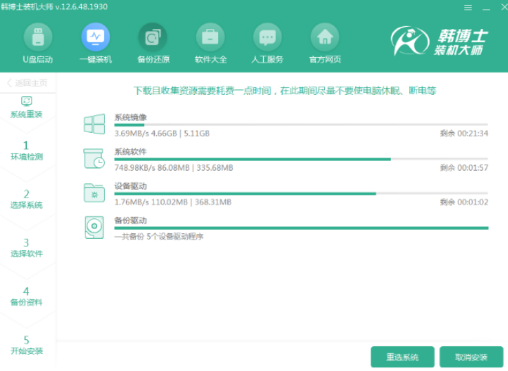 5、備份資料完成后,選擇安裝系統(tǒng),韓博士裝機(jī)大師就會(huì)自動(dòng)為我們下載系統(tǒng),并進(jìn)行第一階段的安裝,我們只需要等待就可以了!