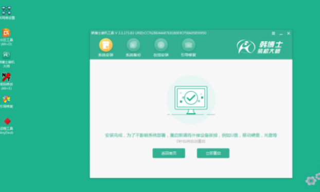 7、安裝完成后,提示重啟電腦,點(diǎn)擊“立即重啟”。重啟電腦后,韓博士裝機(jī)大師會(huì)自動(dòng)對(duì)系統(tǒng)進(jìn)行部署,并幫我們安裝驅(qū)動(dòng)與軟件,這樣一來不會(huì)出現(xiàn)因?yàn)槿鄙倬W(wǎng)卡驅(qū)動(dòng)而導(dǎo)致無法上網(wǎng)的情況發(fā)生了。