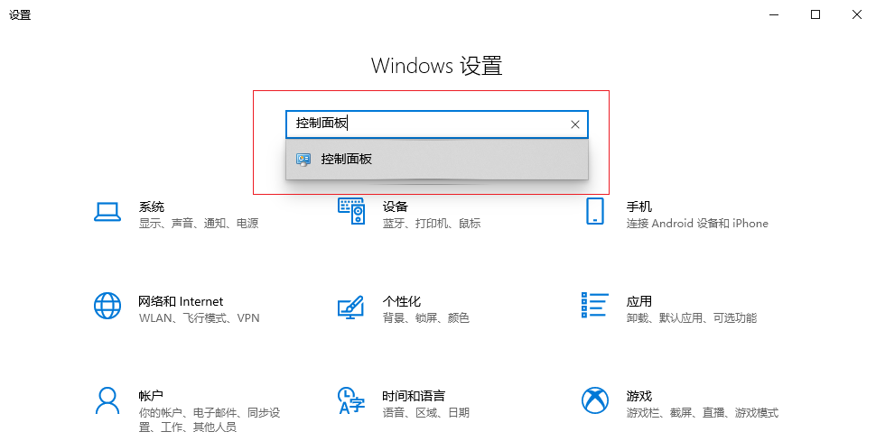 1.在鍵盤上按下【win+i】組合鍵,調(diào)出設(shè)置選項(xiàng)界面,然后在上方搜索欄輸入【控制面板】,點(diǎn)擊進(jìn)入。