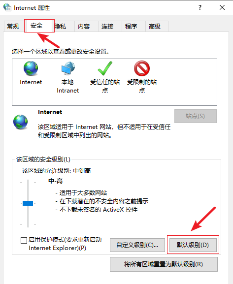 3.進(jìn)入Internet屬性界面,在上方切換到【安全】選項(xiàng),然后點(diǎn)擊【默認(rèn)級(jí)別】。