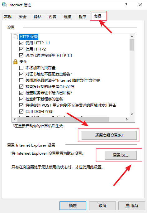 4.接著切換到【高級(jí)】選項(xiàng)卡,點(diǎn)擊【還原高級(jí)設(shè)置】-【重置】。