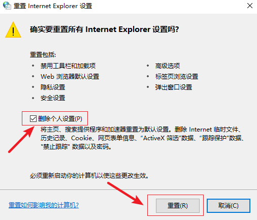 5.進(jìn)入以下界面,勾選【刪除個(gè)性化設(shè)置】,最后點(diǎn)擊【重置】按鈕即可。