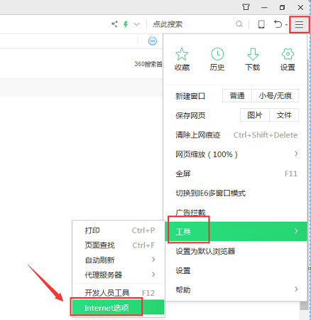 1.打開瀏覽器(以360瀏覽器為例),選擇瀏覽器右上角“設(shè)置”的符號(hào),接著點(diǎn)擊【工具】,選擇【Internet選項(xiàng)】。