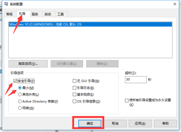 2.進入系統(tǒng)配置界面,上方的選項卡切換到【引導(dǎo)】,然后依次勾選【安全引導(dǎo)】-【最小】,接著點擊【確定】按鈕。