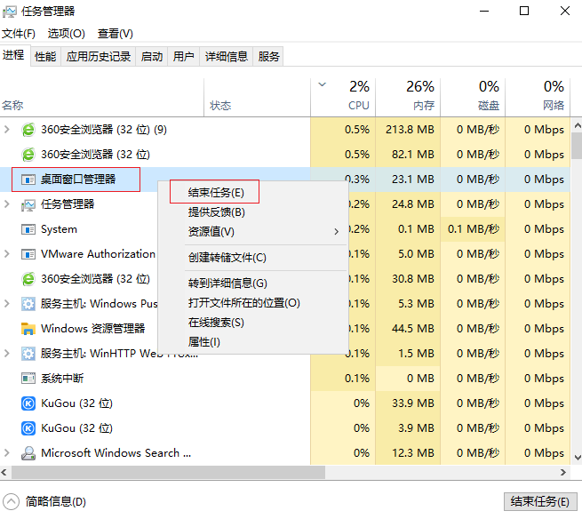 2.進入后,找到并右鍵【桌面窗口管理器】,選擇【結(jié)束任務(wù)】。