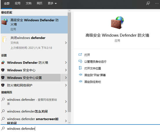 在搜索框輸入【windows defender】,點擊第一個【windows defener安全中心】進(jìn)行全方面檢查。