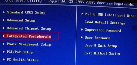 1.重啟動(dòng)電腦,然后在開(kāi)機(jī)時(shí)不停按啟動(dòng)熱鍵進(jìn)入到bios設(shè)置頁(yè)面并找到【Integrated Peripherals】,接著回車(chē)。