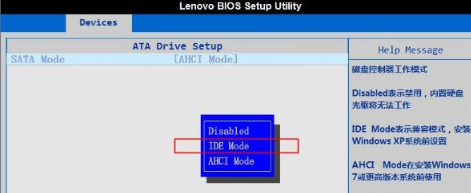 2.接著選擇【sata mode】,回車(chē),在彈出的小窗口,選擇【ide mode】。