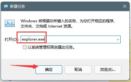 3.在彈出的新建任務的窗口輸入【explorer.exe】,接著點擊下方的【確定】,稍等一下電腦桌面就恢復正常。