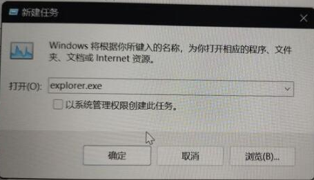 3.在彈出的運行窗口輸入“explorer.exe”,然后勾選下方管理權(quán)限,最后點擊“確定”即可。