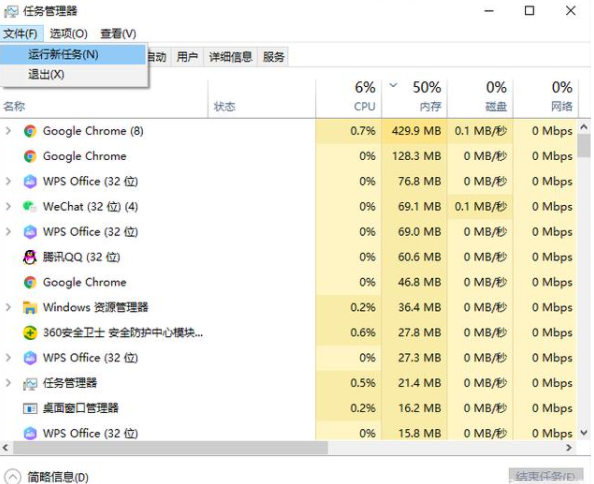 2.進(jìn)入任務(wù)管理器后,在左上角依次點擊“文件”-“運(yùn)行新任務(wù)”。