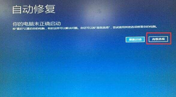 1.按電腦重啟鍵重新啟動(dòng)計(jì)算機(jī),重復(fù)這個(gè)操作三次以上,電腦出現(xiàn)自動(dòng)修復(fù)界面,選擇“高級選項(xiàng)”。