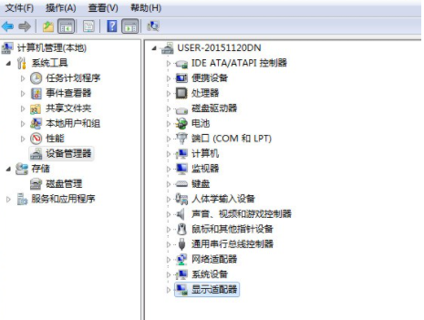 4.點擊“設(shè)備管理”,找到最后一項“顯示適配器”,右擊選擇顯卡驅(qū)動