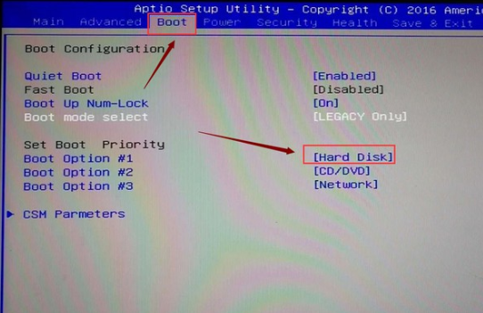 2.進入后,使用鍵盤的左右鍵切換到“Boot”工具欄,選擇“Boot Option#1”并回車展開,將第一啟動項改為硬盤,然后按F10保存就可以了。