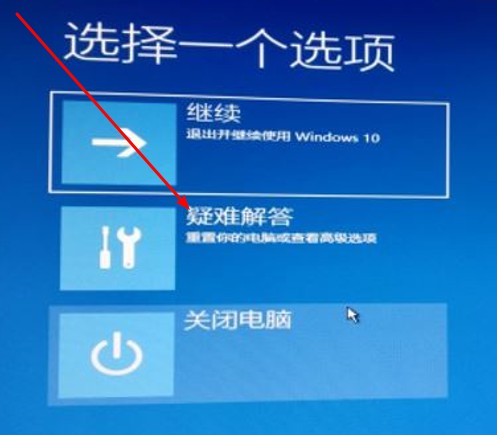 1.電腦強(qiáng)制按電源鍵關(guān)機(jī),此步驟重復(fù)三次。出現(xiàn)“選擇一個(gè)選項(xiàng)”頁面,然后點(diǎn)擊中間項(xiàng)“疑難解答”。