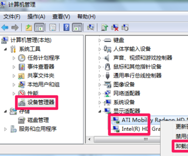 4.選擇“設(shè)備管理器”,點開“顯示適配器”,右擊“顯卡驅(qū)動”選擇”卸載”。