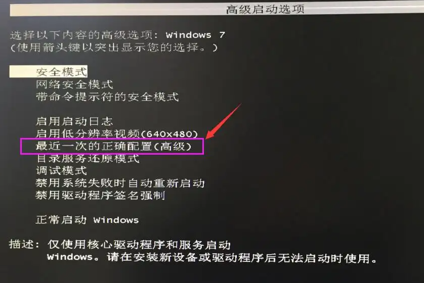 開機后按F8,進入“高級啟動選項”,用鍵盤上下方向鍵選擇“最后一次的正確配置”,回車進入,然后等待系統(tǒng)自動修復完成后再重啟電腦即可。
