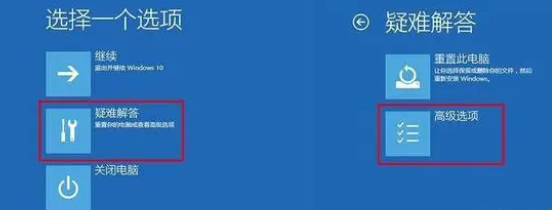 1.連續(xù)重啟,讓電腦進(jìn)入系統(tǒng)回復(fù)界面,然后依次點(diǎn)擊“疑難解答”-“高級選項(xiàng)”。