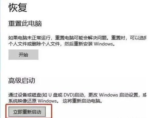 1.在電腦上依次點(diǎn)擊“設(shè)置”-“更新與安全”-“恢復(fù)”-“高級(jí)啟動(dòng)”,選擇“立即重新啟動(dòng)”。