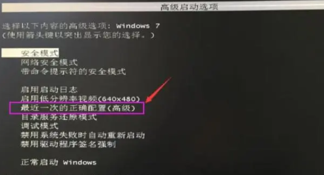 重啟電腦,多次按下鍵盤(pán)的F8鍵,然后電腦就彈出了“高級(jí)啟動(dòng)選項(xiàng)”,接著我們需要找到“最后一次的正確配置”選項(xiàng),并按下鍵盤(pán)回車鍵進(jìn)入,這樣就可以進(jìn)入系統(tǒng)。