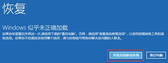 1.連續(xù)重啟電腦多次,進入恢復界面,點擊“查看高級修復選項”按鈕。