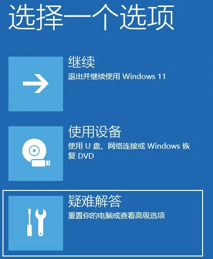 1.強(qiáng)制關(guān)閉電腦三次,之后系統(tǒng)會進(jìn)入高級啟動菜單,選擇“疑難解答”。