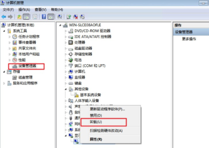 2.進(jìn)入后,右擊“此電腦”,選擇“管理”。進(jìn)入計算機(jī)管理頁面后,再點擊“設(shè)備管理器”,展開“顯示適配器”,右擊顯卡驅(qū)動并選擇“卸載”。