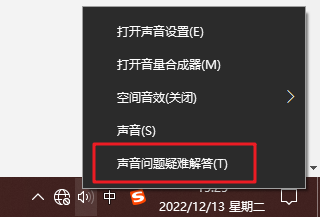 1.找到電腦右下角的聲音圖標(biāo),右擊選擇“聲音問題疑難解答”。