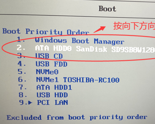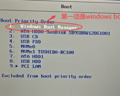 3.進(jìn)入Boot菜單后,首先看到第一項“Windows Boot Manager”,需要將硬盤改為第一啟動項。
