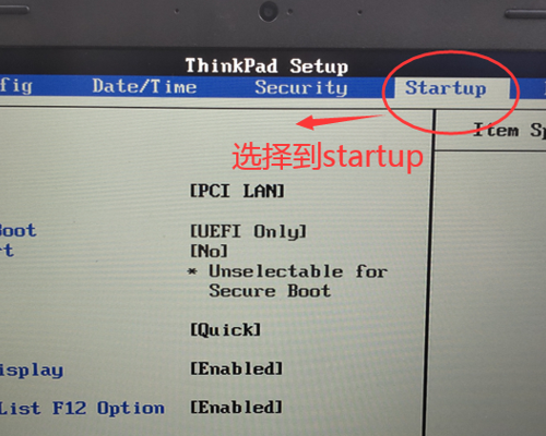 1.重啟電腦狂按F1,進(jìn)入電腦Bios設(shè)置。然后用鍵盤的方向鍵,選擇“Startup”。