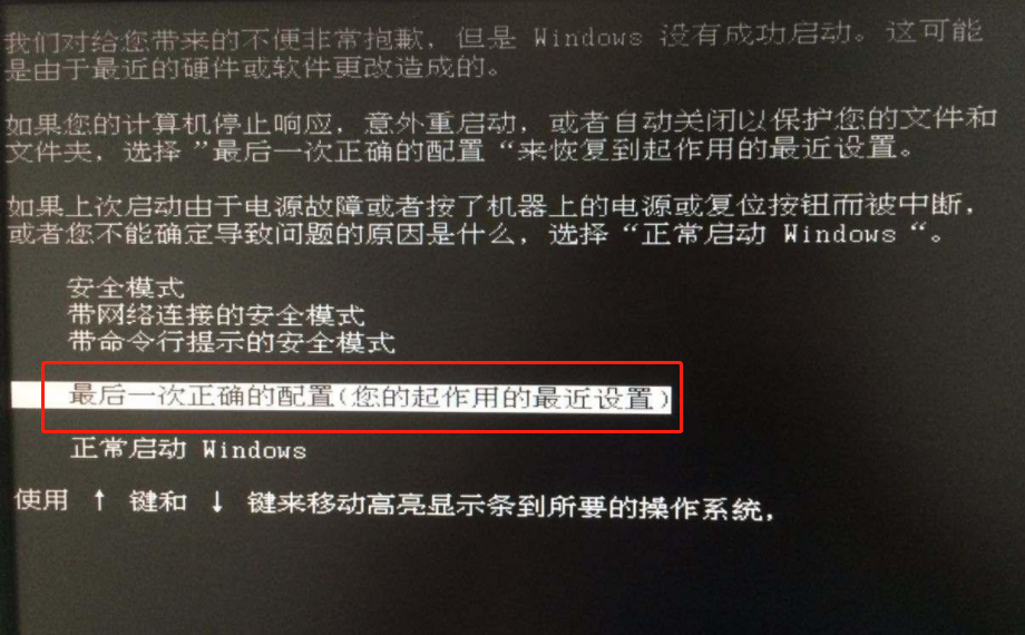 藍(lán)屏代碼0x0000007b,其中一個(gè)原因是硬盤模式設(shè)置錯(cuò)誤而造成的,所以我們可以試試退回設(shè)置前的系統(tǒng)。重啟電腦,按F8進(jìn)入高級(jí)選項(xiàng)頁(yè)面,進(jìn)入后再選擇“最后一次正確的配置”即可。