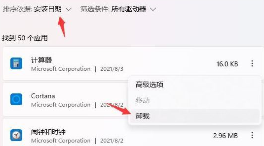 3.將左上方的排序依據(jù)改成安裝日期,依次卸載上一次安裝的應用。