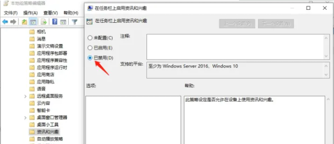 2.點擊“資訊和興趣設置”,雙擊“在任務欄上啟用資訊和興趣”,點擊“已禁用”,再點擊下方的確定即可。