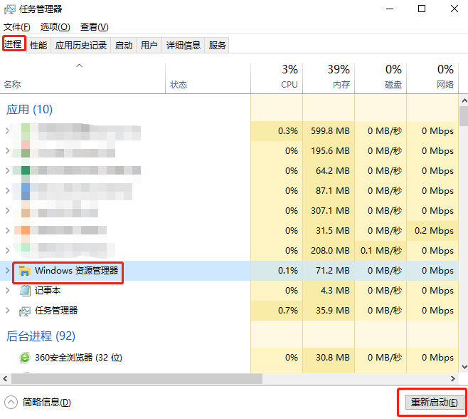 用快捷鍵“ctrl+shift+esc”打開任務管理器。進入后,點擊“文件”“進程”“windows資源管理器”,點擊重新啟動即可。