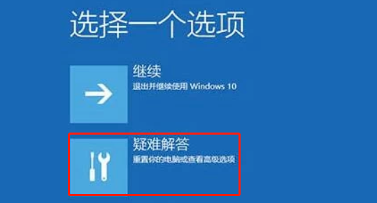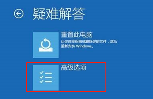 1.強(qiáng)制重啟電腦至少三次,直到出現(xiàn)“高級(jí)修復(fù)選項(xiàng)”界面。之后點(diǎn)擊進(jìn)入,選擇“疑難解答”。