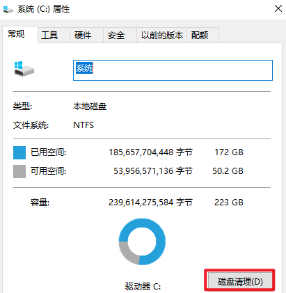 有時候如果磁盤空間不足,那也是會導致重裝系統(tǒng)中斷的,所以我們很有必要對磁盤進行清理。進入系統(tǒng)屬性頁面,在“常規(guī)”下選擇“磁盤清理”即可。