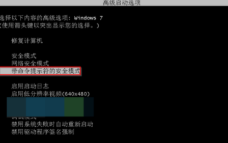 1.在開機(jī)時(shí)按下F8,點(diǎn)擊“帶命令提示符的安全模式”。