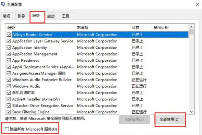 3.進(jìn)入系統(tǒng)配置窗口,點(diǎn)擊“服務(wù)”功能,找到左下角的“隱藏所有Microsoft服務(wù)”選項(xiàng),勾選,再選擇“全部禁用”即可。完成后,再重啟電腦即可恢復(fù)。